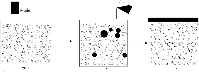 Expliquez le mélange entre l’huile et l’eau. Croquis (les proportions des tailles de l’eau, de l’huile et du savon ne sont pas respectées).