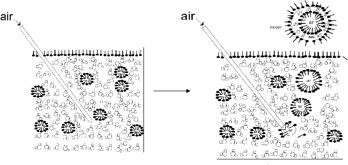 En surface, la partie ionique est dans l’eau et la partie hydrocarbonée en dehors. Le savon s’étale en surface en couche monomoléculaire. Dans l’eau, il forme des micelles dans lesquelles la partie ionique est à l’extérieur et la partie hydrocarbonée à l’intérieur emprisonnant la graisse si l’eau en contenait. On peut ainsi dire que le savon dissout ou, plutôt, disperse la graisse dans l’eau. Ces micelles étant relativement grosses, l’eau savonneuse apparaît trouble.