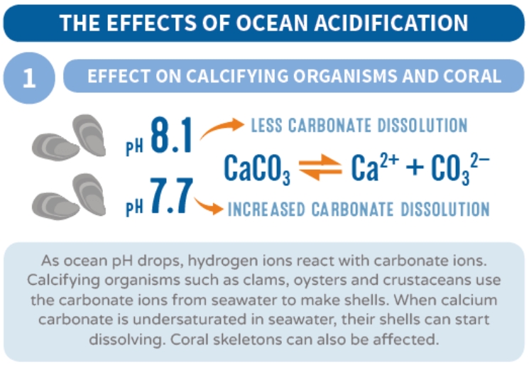 Les projections actuelles suggèrent que le $\ce{pH}$ moyen à la surface de l'océan chutera à environ $7,7$ d'ici $2100$, une diminution qui représenterait une augmentation d'environ $150\%$ de l'acidité par rapport au niveau actuel 3.