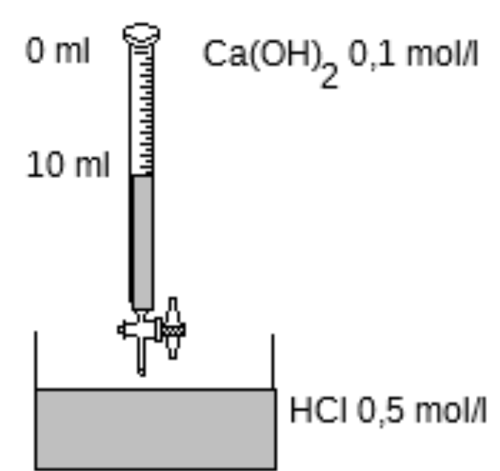 À l’aide du schéma ci-dessous, répondez aux questions (voir image : les $10\,\mathrm{mL}$ de $\ce{Ca(OH)2}$ ont permis d'atteindre le point d'équivalence = virage de l’indicateur coloré):