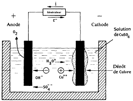 Prenons le cas, illustré ci-dessus, de l'électrolyse d'une solution de $\ce{CuSO4}$.