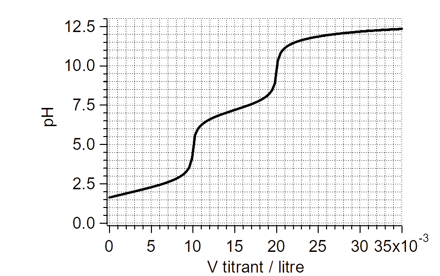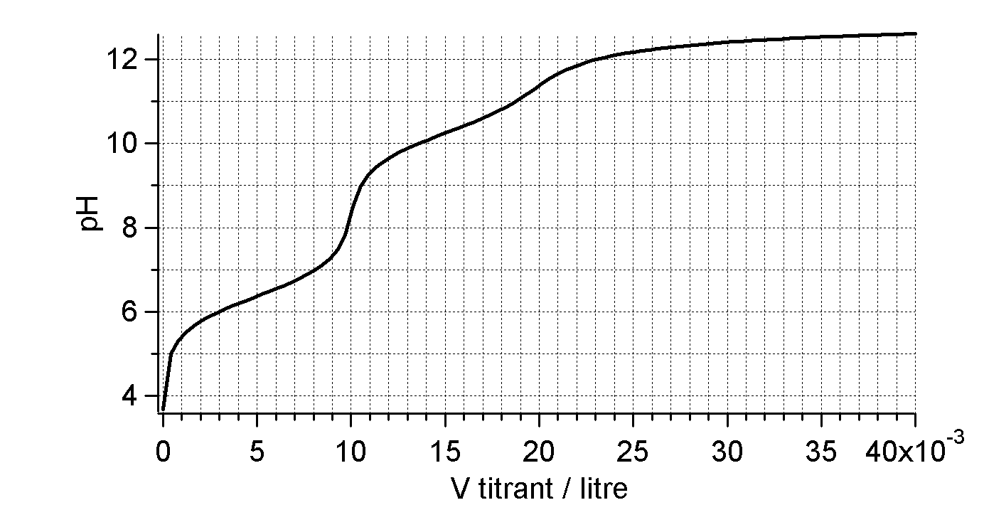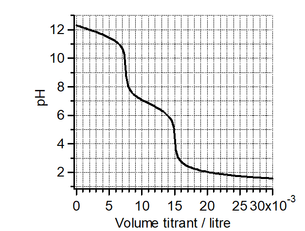 Soit la courbe de titration de $10\,\mathrm{mL}$ de $\ce{Na3PO4}$ par du $\ce{HCl}$ $0,1\,\mathrm{mol/L}$.